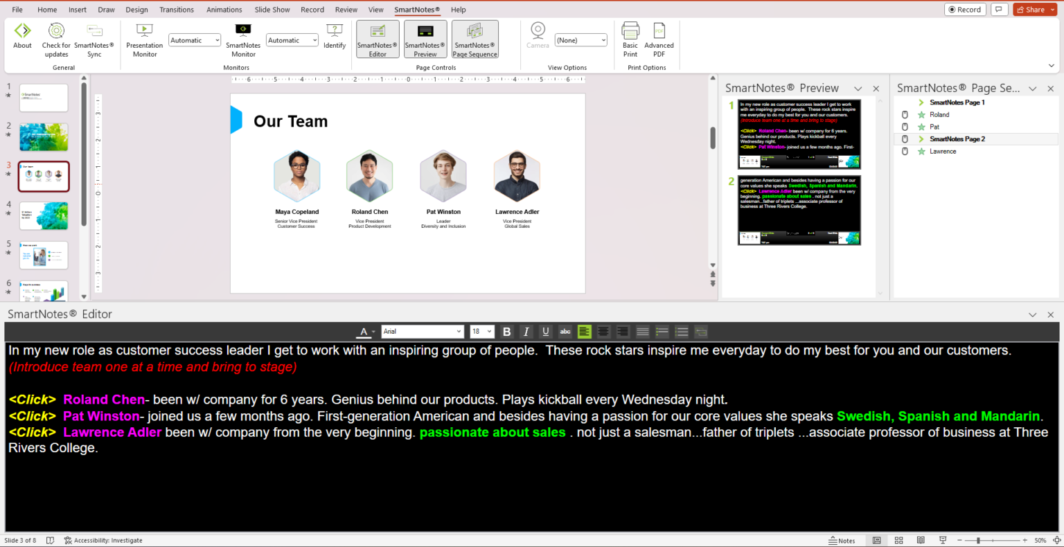 Choose font size and color. No more scrolling. All notes pages stay synchronized with your slides and securely saved in the file.